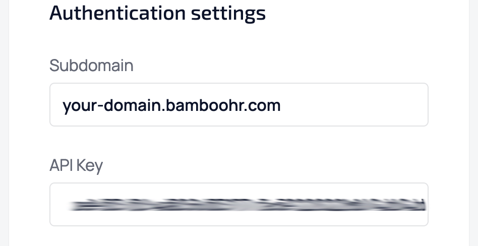 - In “Authentication settings” provide your “BambooHR site URL”, and “API Token” from Step 1 of the guide.