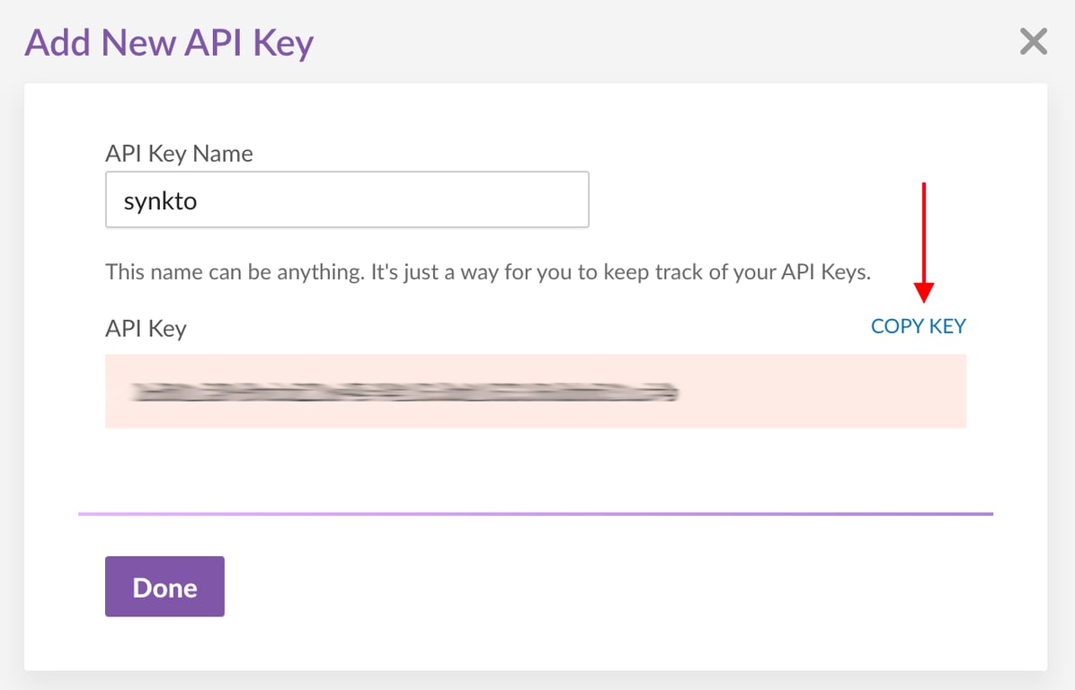 - Click “Copy Key” and save the API key, and click “Done”. Note that for security reasons it isn’t possible to view the token after closing the dialog. If necessary, create a new token.