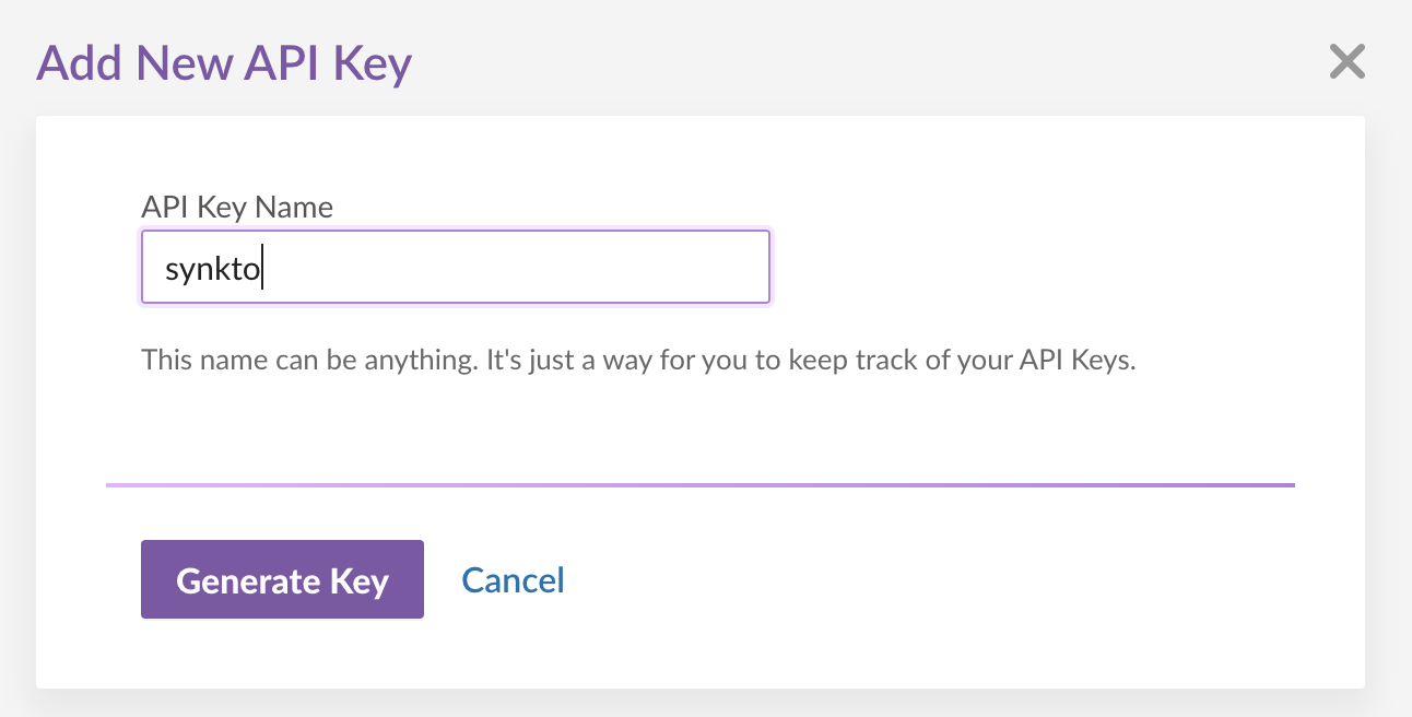 - In the opened window enter “synkto” as the API Key Name for your token and click “Generate Key”.