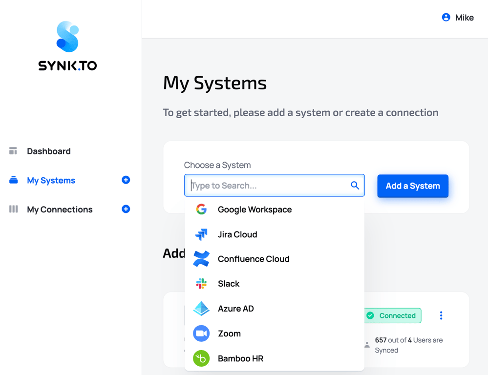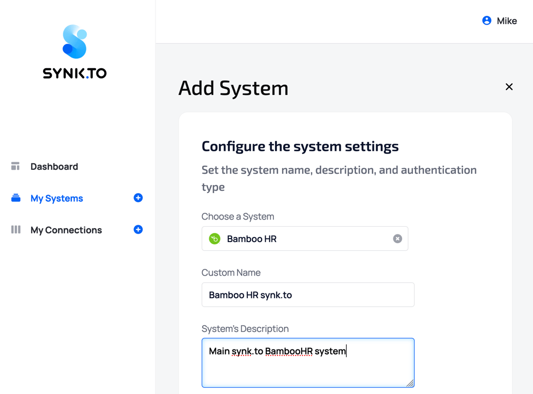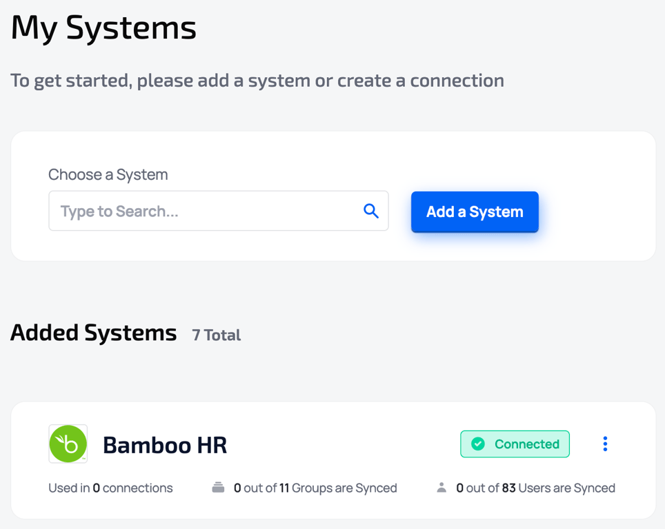 Go to the SynkTo Systems page, find BambooHR in “Choose a System” field, and click “Add a System”.