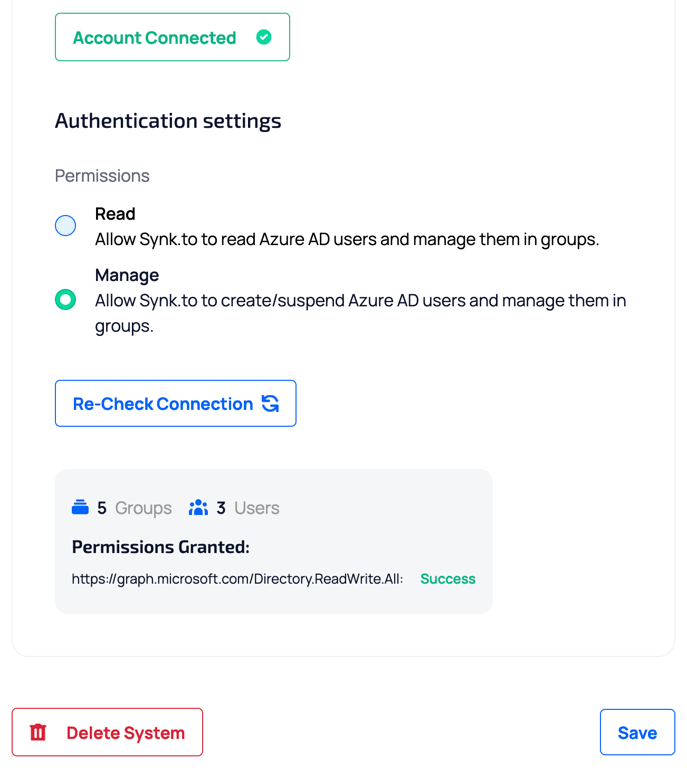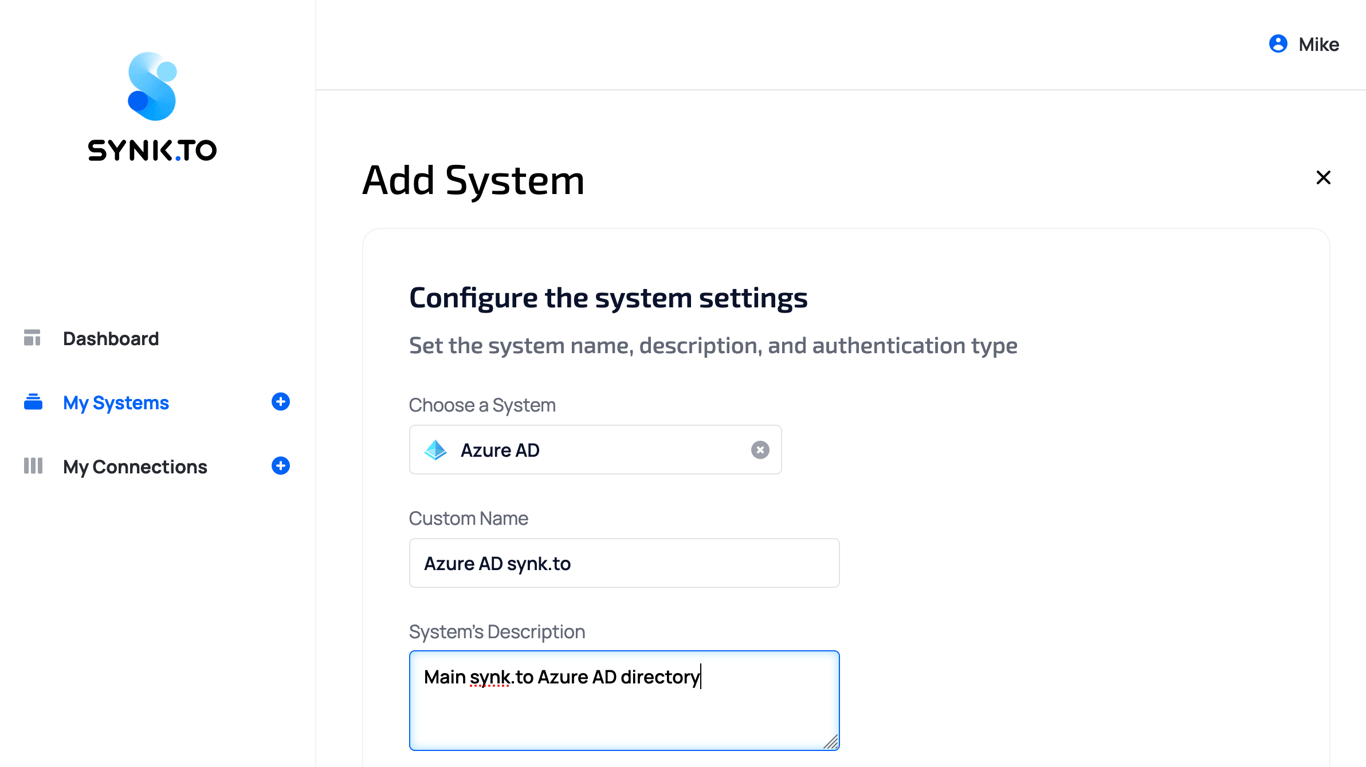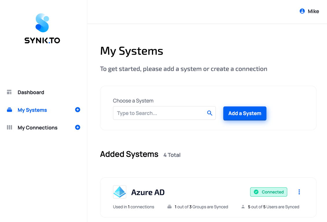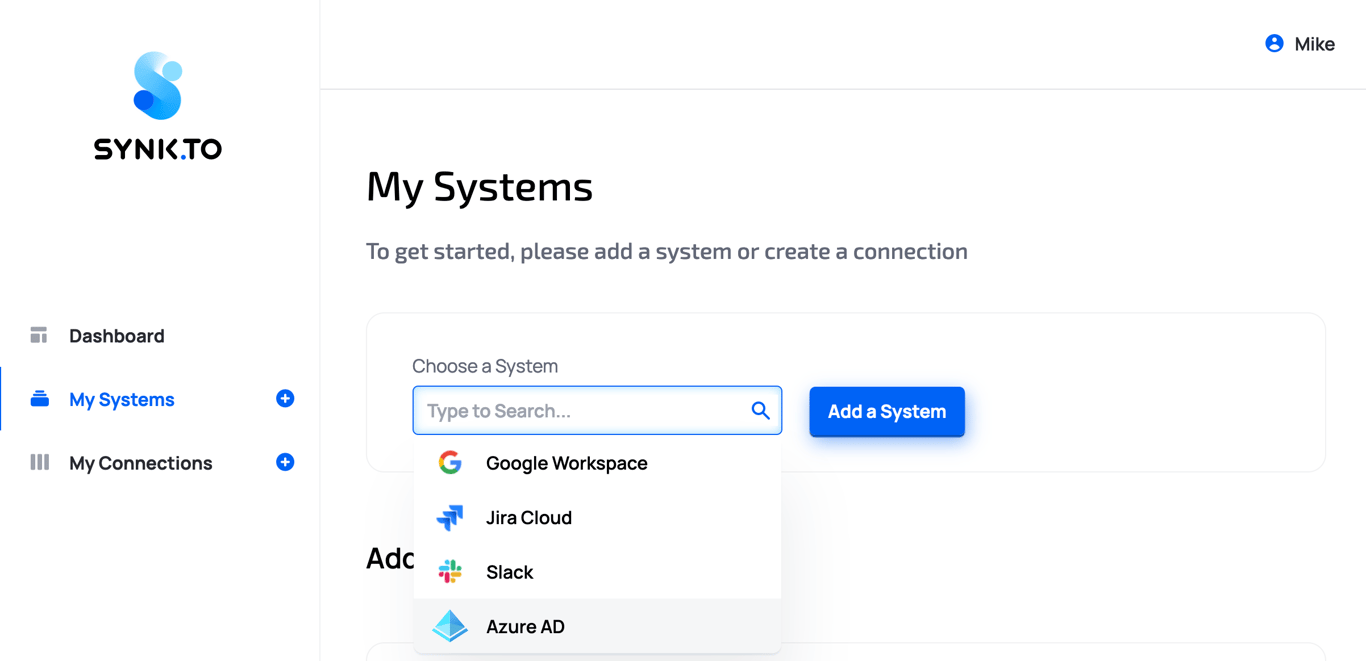 - Go to the SynkTo Systems page, find Entra ID in “Choose a System” field, and click “Add a System”.