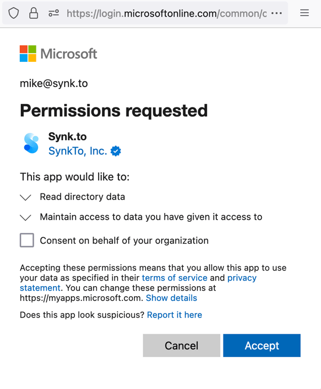 - Click “Accept” button on a Microsoft permission pop-up window.