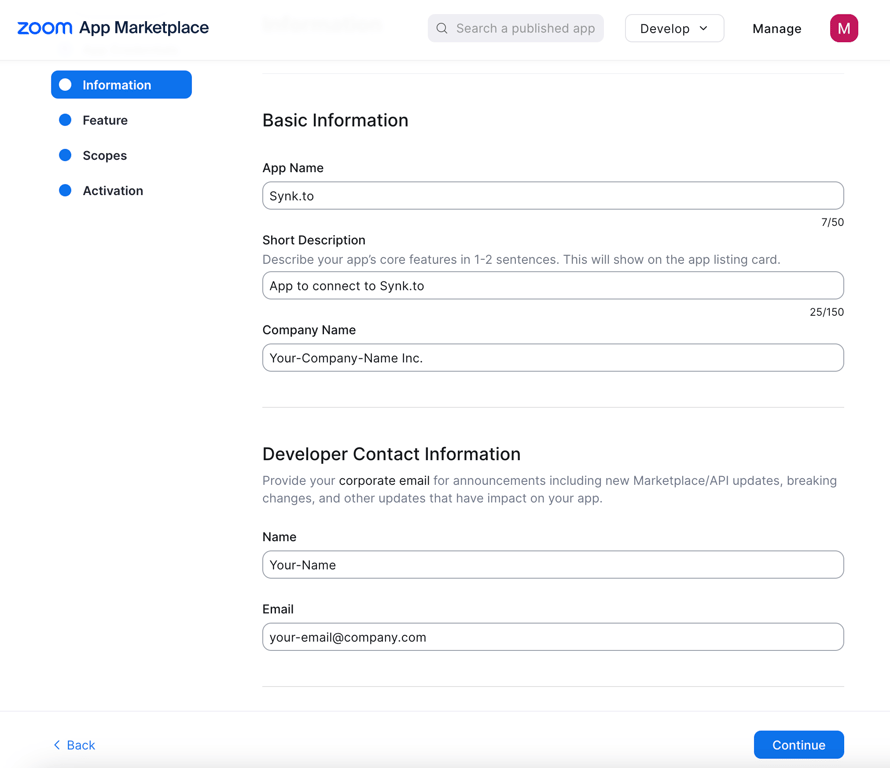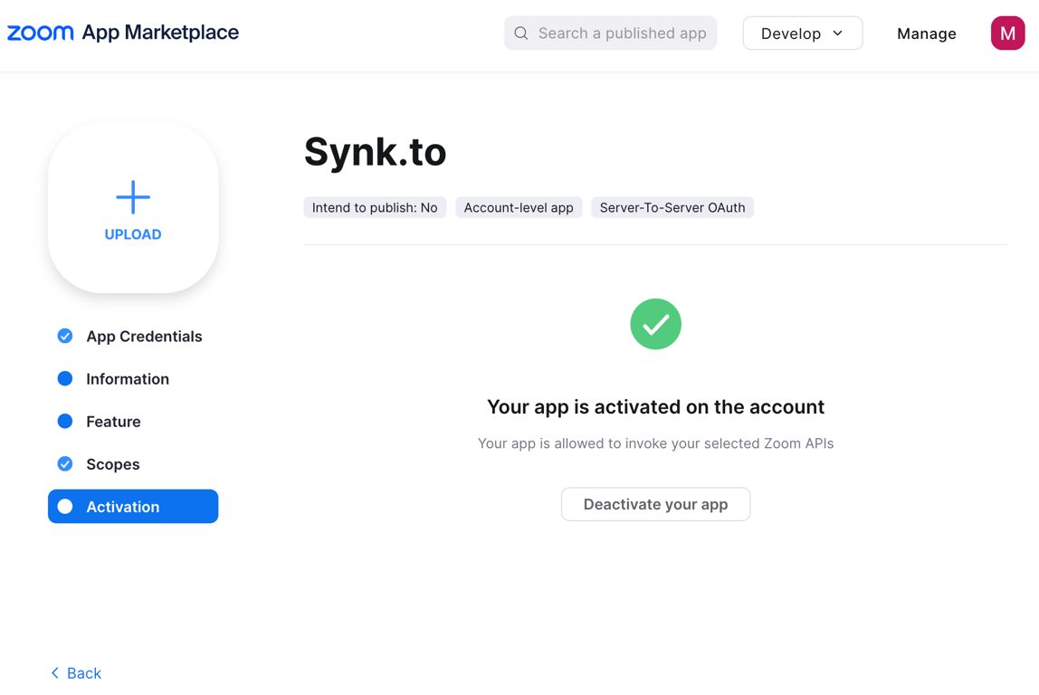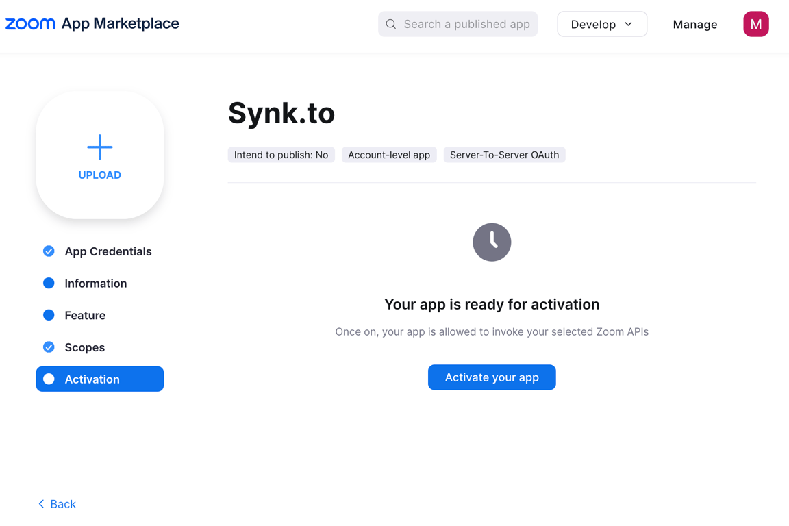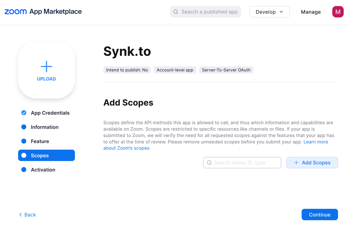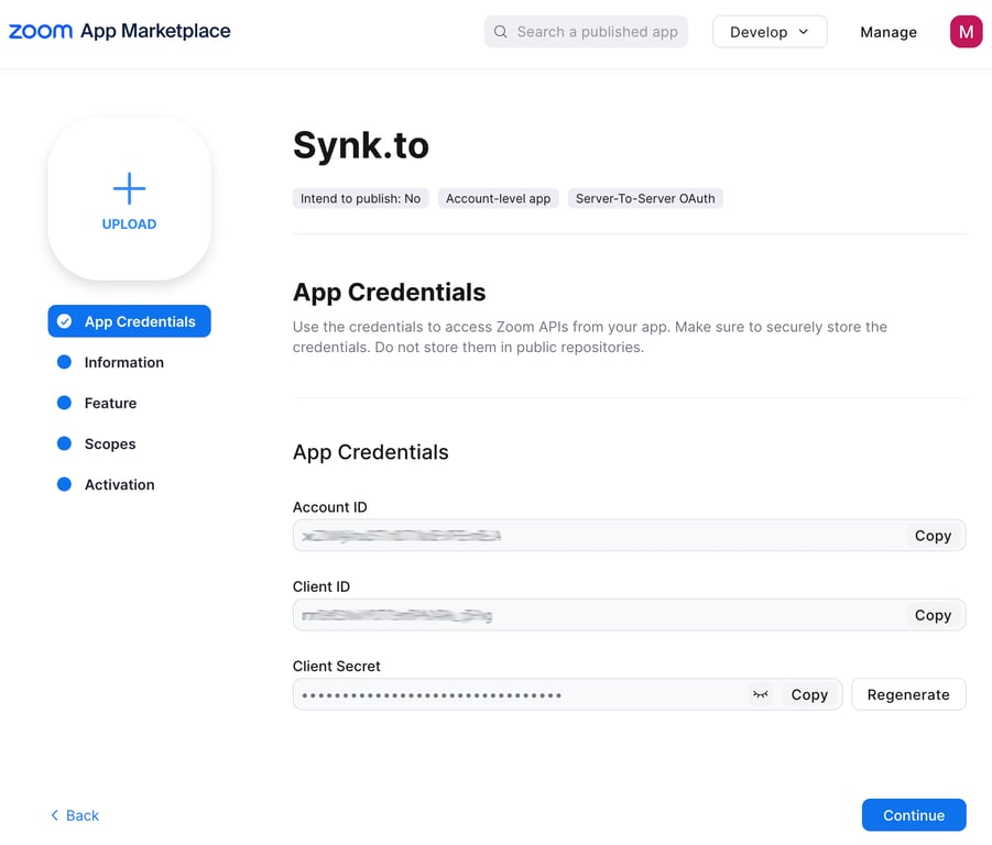 Step 1: Create Zoom application for Synk.to