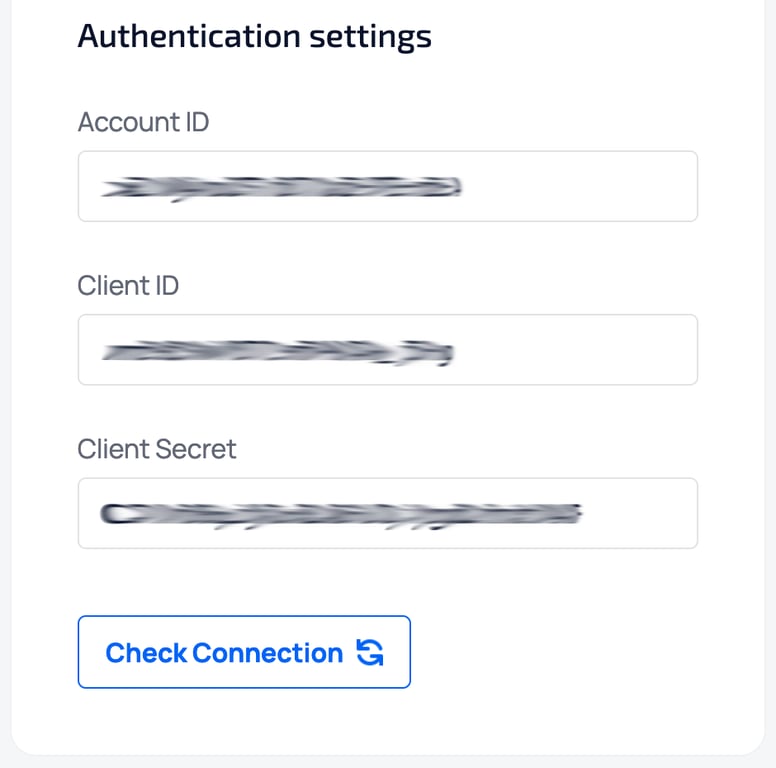 - In “Authentication settings” provide your “Account ID”, “Client ID”, and “Client Secret” from the Step 1 of this instruction.