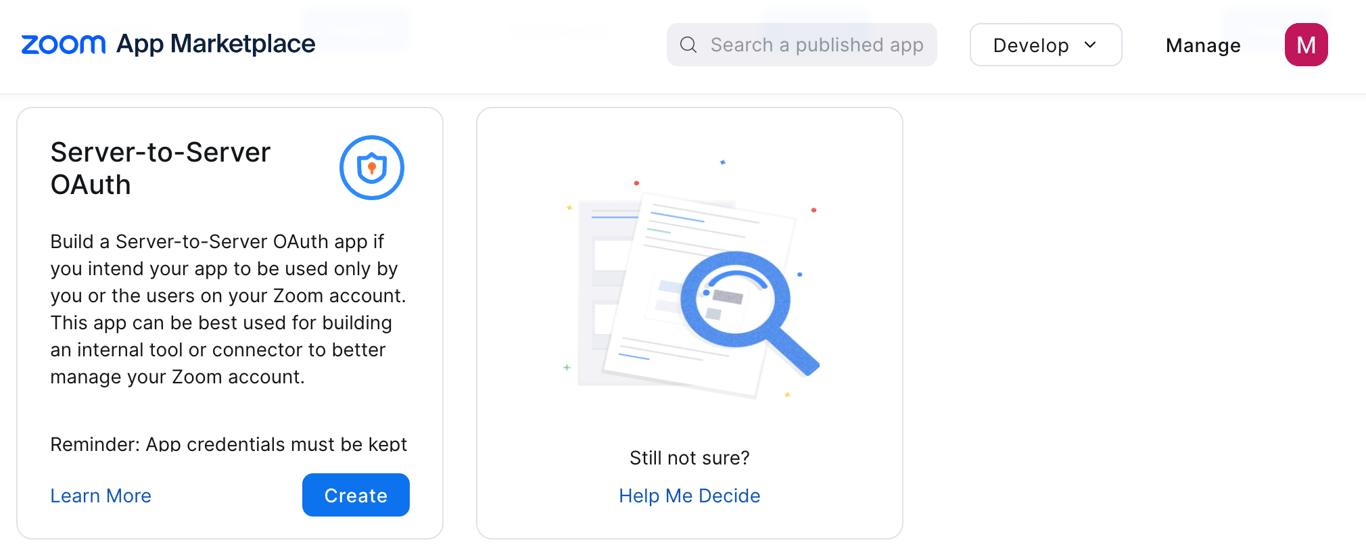 - Go to https://marketplace.zoom.us/develop/create and click “Create” for Server-to-Server OAuth app.