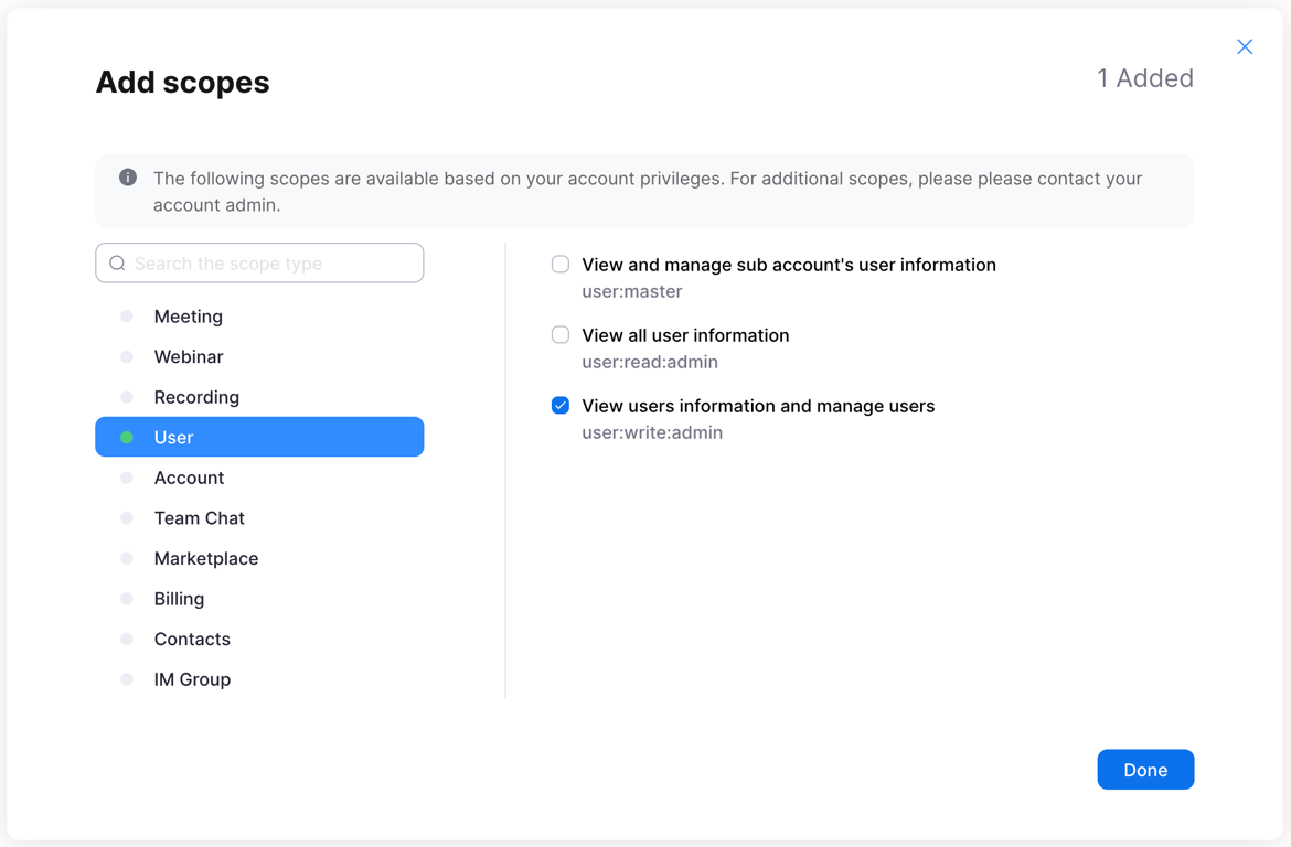 In “Add scopes” window click on “User” section and choose “View users information and manage users” first. After that click on “Group” section, choose “View and manage groups”, and click “Done”. Synk.to needs this permission to sync users and groups.