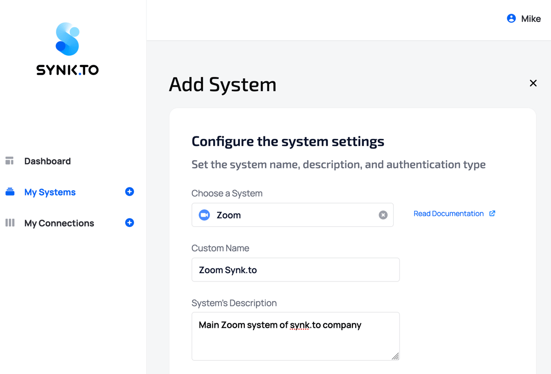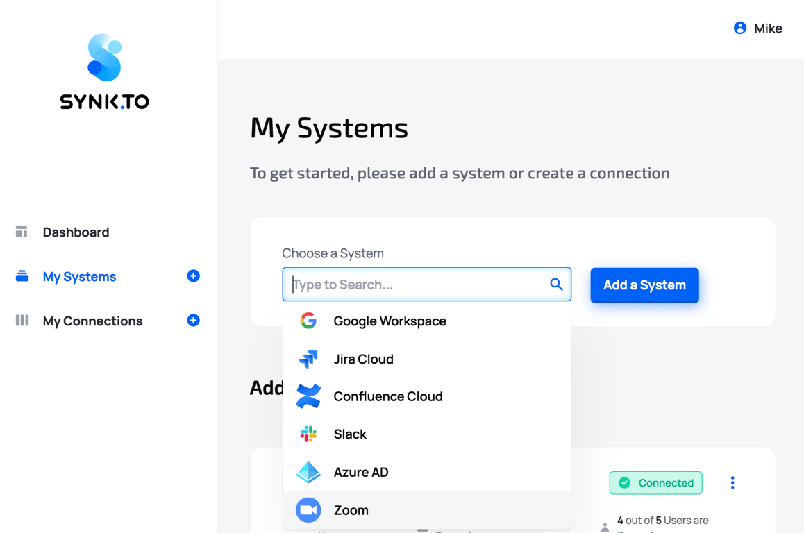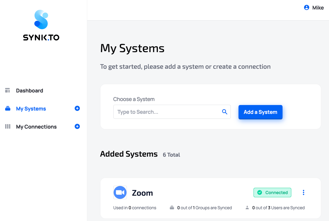 Go to the SynkTo Systems page, find Zoom in “Choose a System” field, and click “Add a System”.