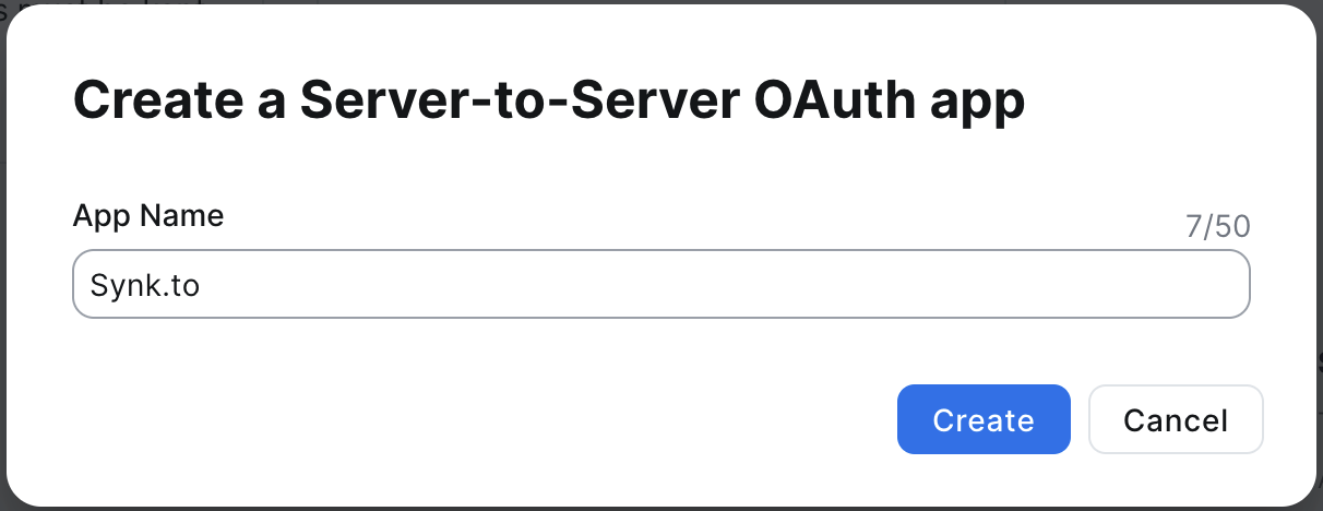- In “Create a Server-to-Server OAuth app” pop-up window type “Synk.to” as App Name.
