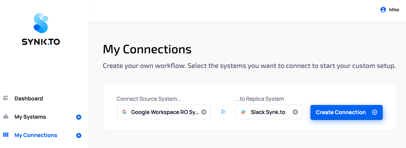 - Choose Google Workspace as a Source System (which will be used as a reference for users and groups) and Slack as a Replica System (which will receive any updates made in Source System), and click “Create Connection”.
